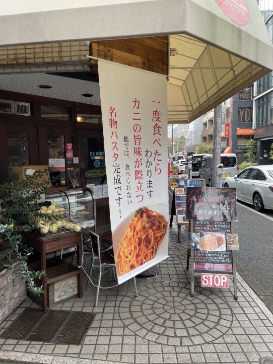 「一度食べたらわかります。カニの旨味が際立つ他では食べられない名物パスタ完成です!」という大きな垂れ幕や「本当に美味しいパスタ食べたことありますか?」というPOPが目に飛び込んでくる神田のパスタ屋さんデニーロ(DE NIRO)。