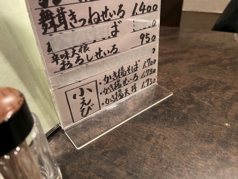お店に入る前から頭の中で決めていましたので、一瞬メニューを見てかき揚げ丼と迷いましたが、初志貫徹、秒で小えびのかき揚げそばを注文しました。