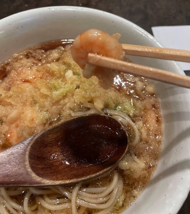 かき揚げとスープとお蕎麦を同時にスプーンに乗せて一気に口の中に流し込むと、病みつきになりそうです。