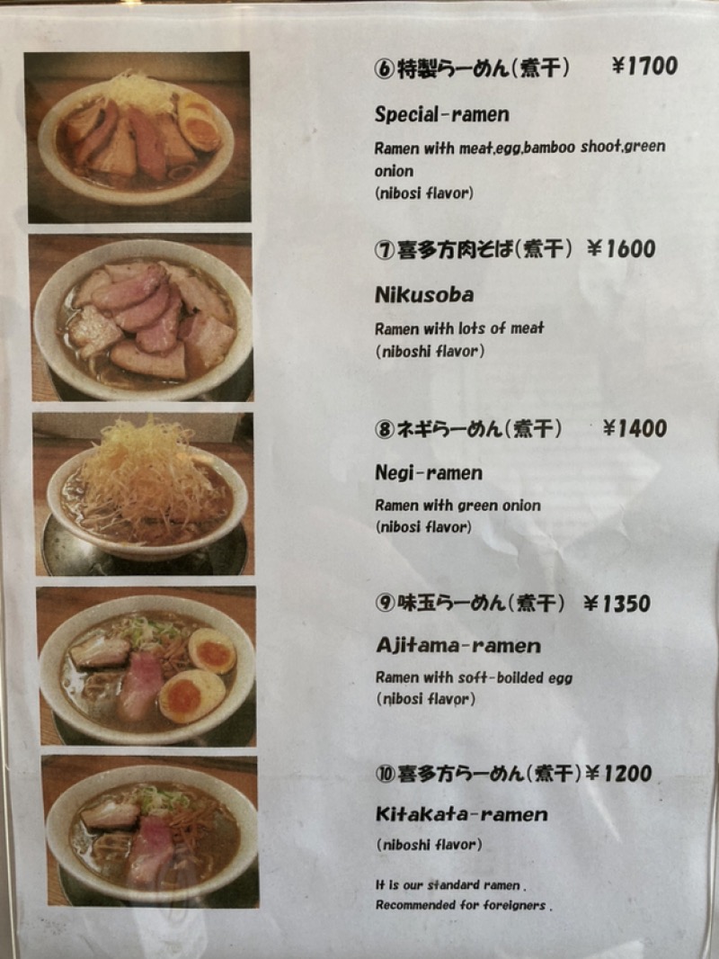 数あるメニューのなかから、私が注文したのは喜多方らーめん(煮干し)1200円です。