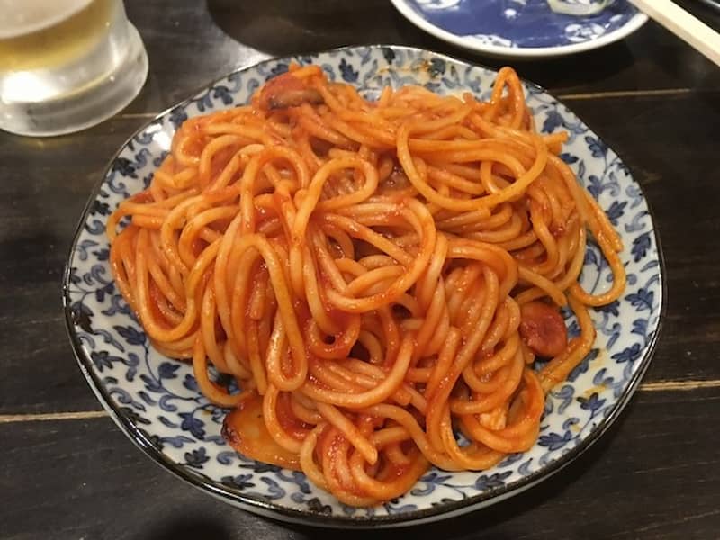 今日は健康のため人形町から歩いて「馬喰トライアングル」と勝手に呼んでいる一角にお店に行きました。平日夕方18:00過ぎ、予約なし、待ちなしで2階のテーブル席に案内されました。店頭には大きな招き猫が置かれており、たくさんの提灯が下がっています。入店すると、1階は完全な立ち飲みで、ドラム缶がテーブル代わりに置かれていました。2階は、ビールケースを使ったテーブル席があるようです。お店の内装も料理も、昭和30年代をコンセプトとして作られているのだとか。BGMは昔の歌謡曲ですし、料理は「焼鳥」「ナポリタン」等、一品300円〜400円ぐらいのメニューが揃っていました。私はハイボールを飲みながら、料理を少し摘んでみました。
