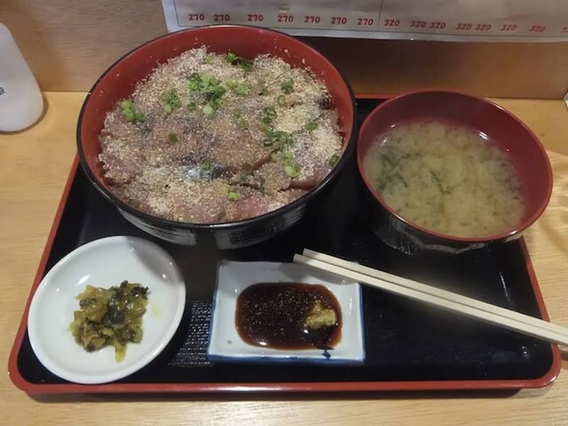 人形町の奥地にあるのを発見した「おか吉水産」というお店。入ってみれば、いかにも立ち飲み酒場という造りの店内、期間限定で本来700円が500円になっているという「房総地魚丼」も気にはなるけれど、もし深掘り再訪することになった場合を考えると、まずは高い方を先に食べておいた方が後が楽だといういつもの判断もあって「サバ漬け丼(800円)」の方をオーダーしました。まあ、どちらにしても、お手頃な立ち食い価格ではあるんですがね。店内の掲示で私の目を惹いたのは、赤い字で「痛風セット」と書かれた貼り紙、痛風といえばこってり美味いものというイメージがあるし、気になったので確認したところ、「塩辛」「あん肝」「数の子」という内容でした。