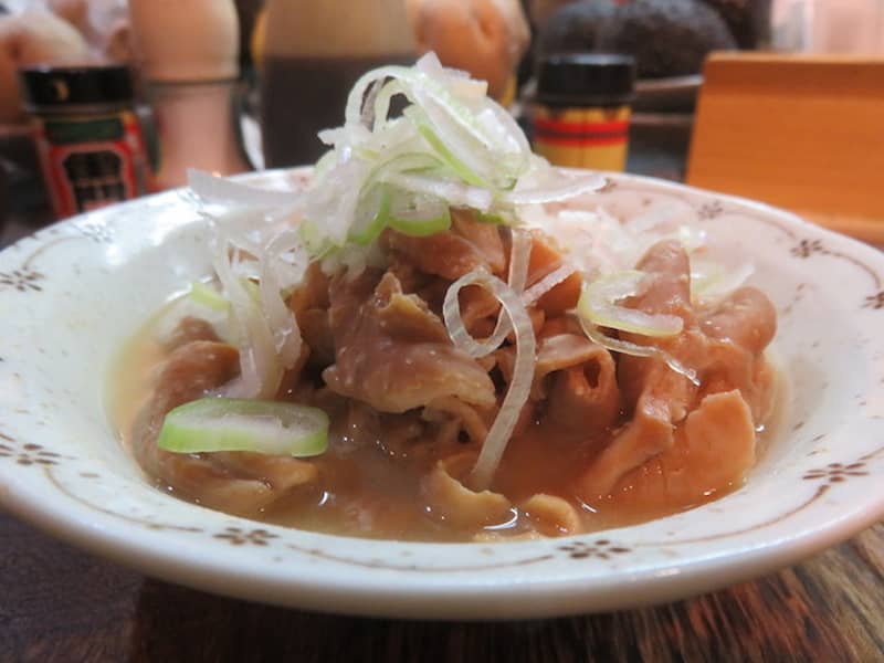 こちらは人形町、地下鉄半蔵門線水天宮前駅から徒歩1分ほどのところにあります。新大橋通り沿いですが、この通りは飲食店が多いですね。オフィス街でもあるし、昼も夜も賑わってそうな感じでしょうね。店内はL字のカウンタ10席、壁側に2人席×4で喫煙OK。1階は立ち飲み、2階は座席と書いてあるけど、店を間違えたのかと思うほど普通にイスがあります。お通しはきんぴらとほうれん草。なかなか渋いお通しが出てくる立ち飲み屋?じゃないですか。このお通しは思いの外レベルが高いです。食事はモツ煮込み、砂肝を注文。モツは牛かな?白味噌仕立てで柔らかく煮込んであります。串焼きはほどよい塩分で味も悪くない。味の方も悪くないし、雰囲気も庶民的な居酒屋らしい感じでした。