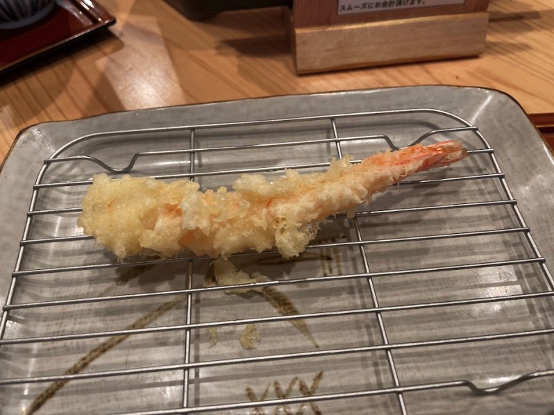 まだお腹にゆとりがあったので、紅生姜の天ぷら、生ホタテ天ぷら、えび(おかわり)を注文しました。