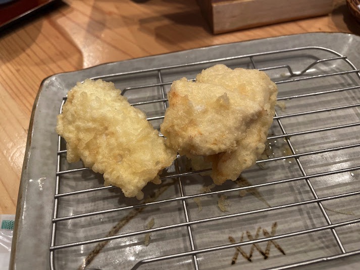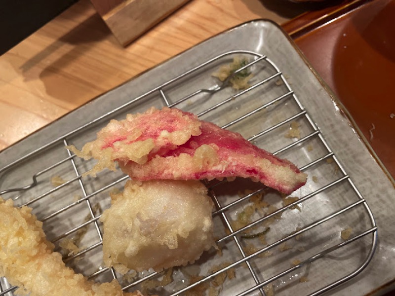 生ホタテはレア状態の天ぷらで、外サク中プリのいい食感です。おいしい。紅生姜天ぷらもいかしてます。